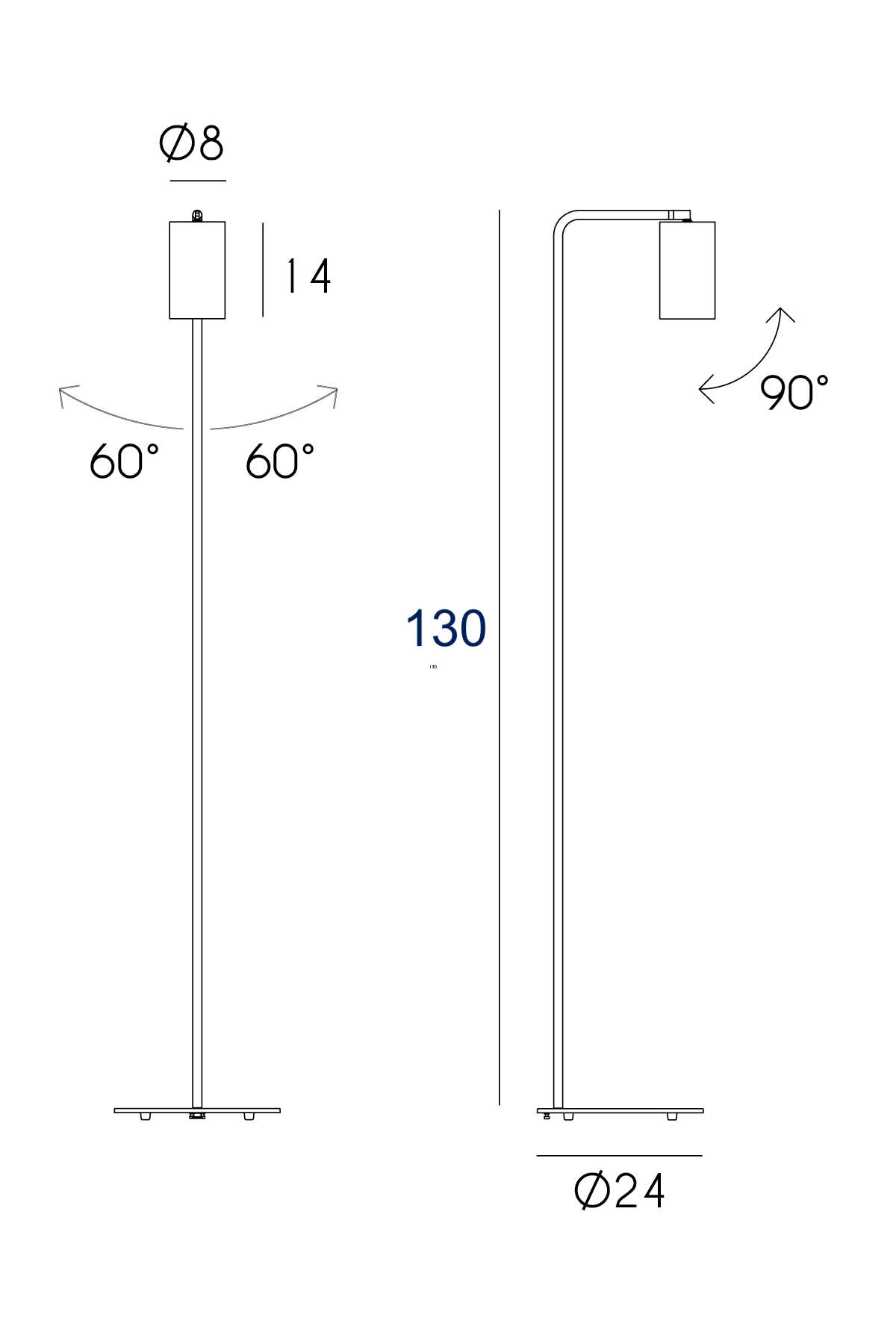 Contemporary reading light for floor for bedrooms and public areas. Lamp socket GU10 for LED lamps. Cylindrical head with spherical joint for orientation. Brass rod with circular section of diam. 13mm. Thin base with steel ballast and four support feet. Finishing with galvanic treatment of at least 20 microns or painting. 180 cm black electric cable with foot switch and plug.