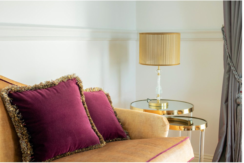 Apparecchio da tavolo per luce diffusa in stile contemporaneo. Per lampadina con attacco E27 max 60W. Base con zavorra in metallo e corpo in tubolare di ottone con trattamento superficiale di min. 20 micron. Asta rivestita con due blocchi in vetro cristallo (30% pb) trasparente sfaccettato. Peso della base 1,8 Kg. e cavo elettrico di lunghezza 150 cm. con interruttore di accensione.