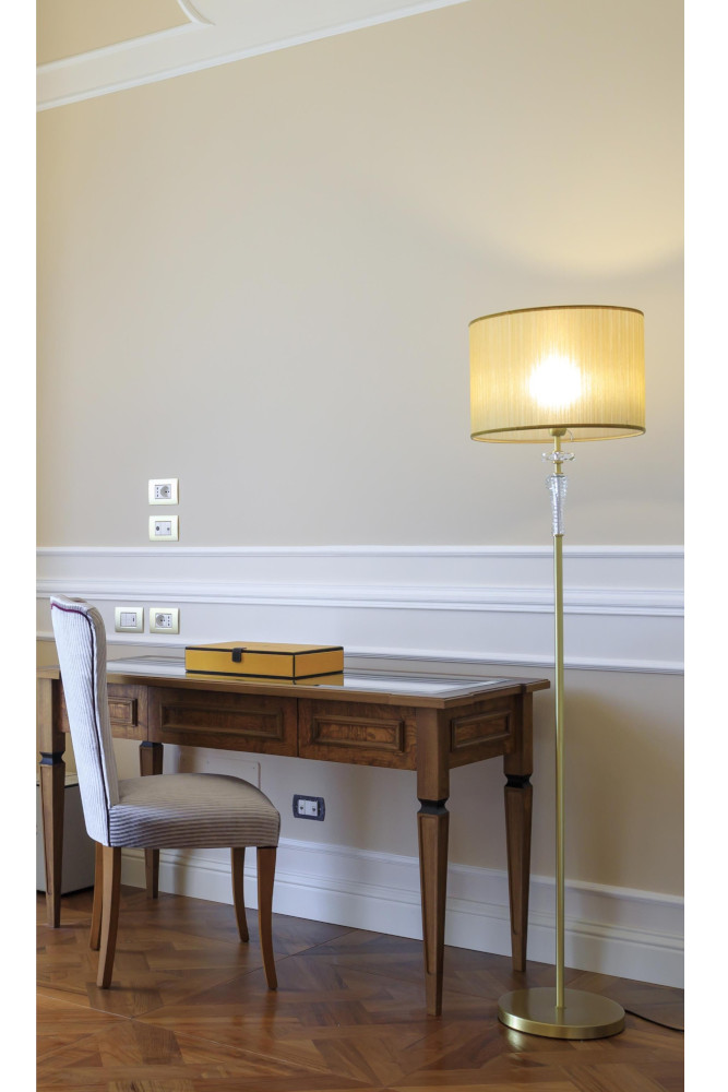 Lampada da terra per luce diffusa di design contemporaneo. Per lampadine con attacco E27. Corpo in acciaio e ottone con trattamento superficiale di min. 20 micron. Due fregi in cristallo sfaccettato trasparente.. Cavo elettrico lungo 185 cm con interruttore a piede. Base di forma tonda diam. 29,5 cm. con zavorra in ghisa di 7,5 kg.